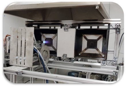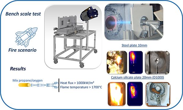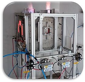 Le banc d’essai feu en oxycombustion développé au sein du laboratoire reproduit un scénario incendie extrême liés à des flux thermique supérieur à 1000kW/m² issu d’un scénario lié à l’étude de l’ablation des composé pour la protection de système. Il permet de simuler. La configuration de base correspond à un impact horizontal de la flamme, mais plusieurs configurations peuvent être envisagées (verticale, angulaire). De plus, le banc s’adapte à une large variété de matériaux, revêtements et structures.