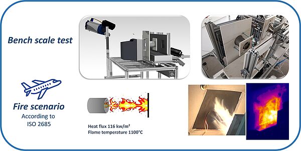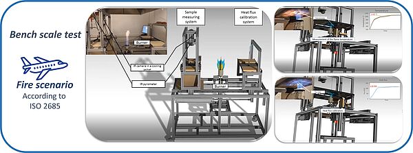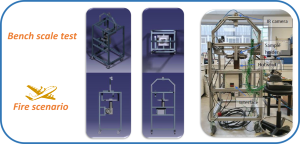 Ce banc est utilisé pour caractériser le comportement au feu de matériaux dans des conditions représentatives des scénarios rencontrés dans l’aéronautique.