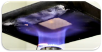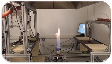 L’application principale de ce banc est la reproduction à échelle réduite d’un scénario feu de batterie, caractérisé par une flamme accompagnée de projections de particules. Le protocole repose sur des cycles alternant phases avec et sans apport de particules, afin d’évaluer la capacité des matériaux à résister à une exposition à une flamme chargée de débris incandescents.