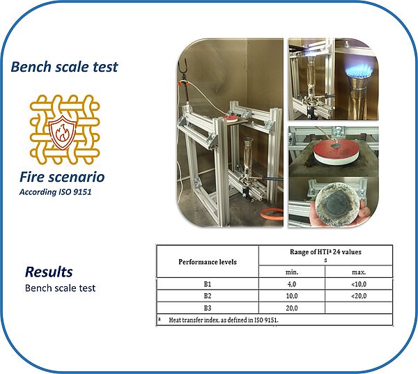 - Simulation réaliste par exposition directe à une flamme normalisée (≈ 80 kW/m²).