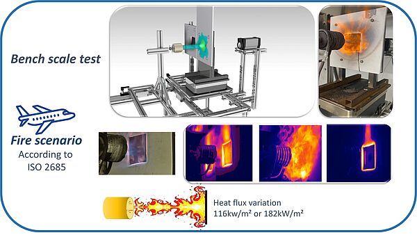 Ce banc est destiné à évaluer la résistance au feu de matériaux composites, revêtements, isolants ou systèmes multicouches, dans des conditions proches des incendies en environnement aéronautique.
