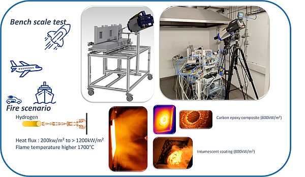 Le banc d’essai feu hydrogène développé au sein du laboratoire reproduit un scénario incendie issu d’une fuite d’hydrogène enflammé. Il permet de simuler différents scénarios feu avec un flux thermique contrôlé et réglable, allant de 200 à plus de 1000 kW/m². La configuration de base correspond à un impact horizontal de la flamme, mais plusieurs configurations peuvent être envisagées (verticale, angulaire). De plus, le banc s’adapte à une large variété de matériaux, revêtements et structures.